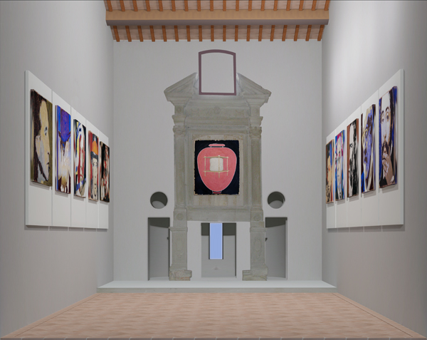 | Fabrizio Ruggiero invented a secular show on the walls, with ten portraits of artists of the past century, as icons of art, and placed the painting A Bruit secret & Pandora’s box in the large niche above the altar to bring the mind of the viewers out of mechanical thought even for just a single moment. |
