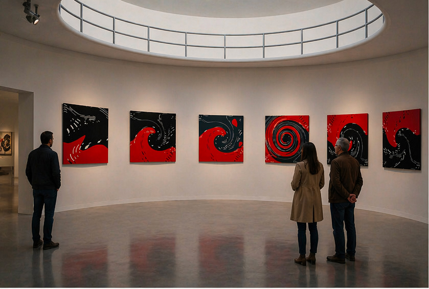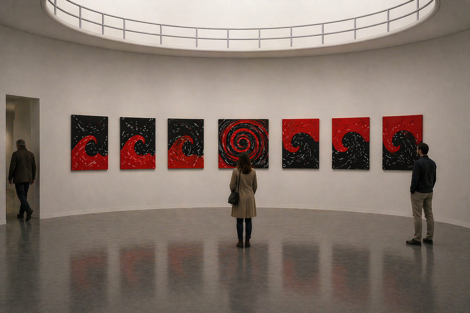 The seven panels unfold as a dual current: two opposing wave formations structured through inverted chromatic fields — a black wave emerging from a red ground and a red wave unfolding within a black field.